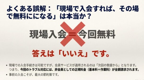 確かに現場で入会手続きをすることは可能ですが、会員としての無料サービスが適用されるのは「次回の救援から」というルールになっています。つまり、呼んでしまったその回のトラブルについては、非会員としての正規料金(基本料+作業料)を支払う必要があります。